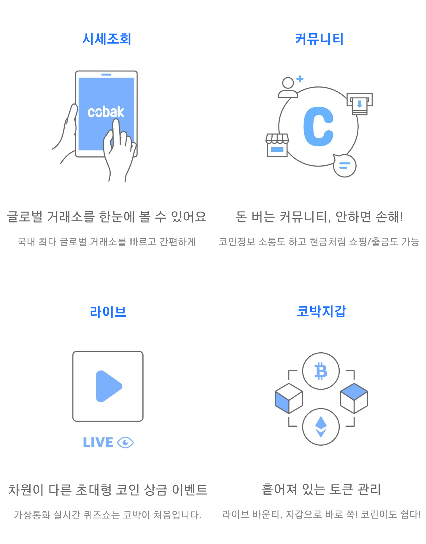 - 커뮤니티 : 돈 버는 커뮤니티, 코인정보 소통도 하고 현금처럼 쇼핑/출금도 가능하다.