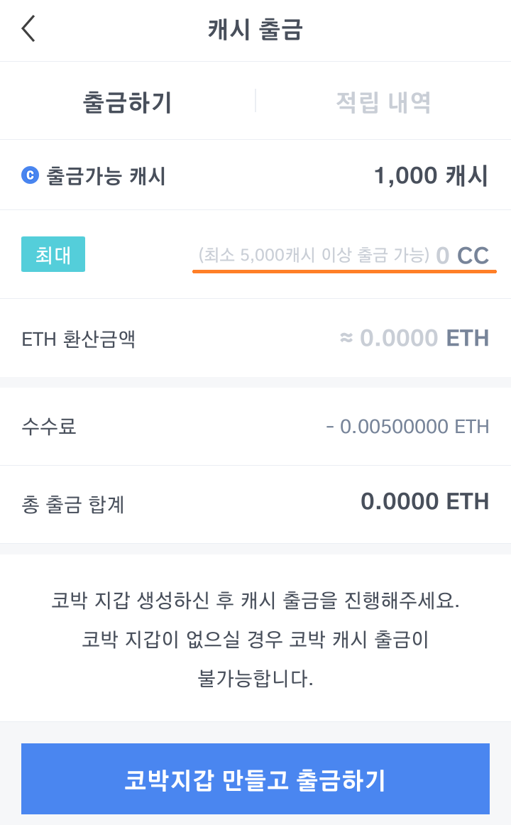 5) 이더리움 지갑 생성(최소 5000캐시 이상 이더리움으로 출금가능)