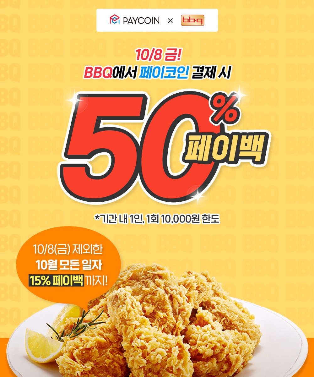 - BBQ 치킨 50% 페이백(1인 1만원 한도) : 9. 8(수)