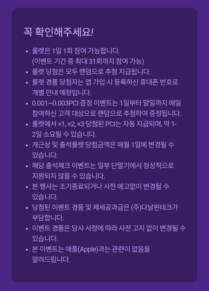 * 결제/페이백 시점 PCI-KRW 환율에 따라 PCI 결제량/페이백량은 변동될 수 있다.
