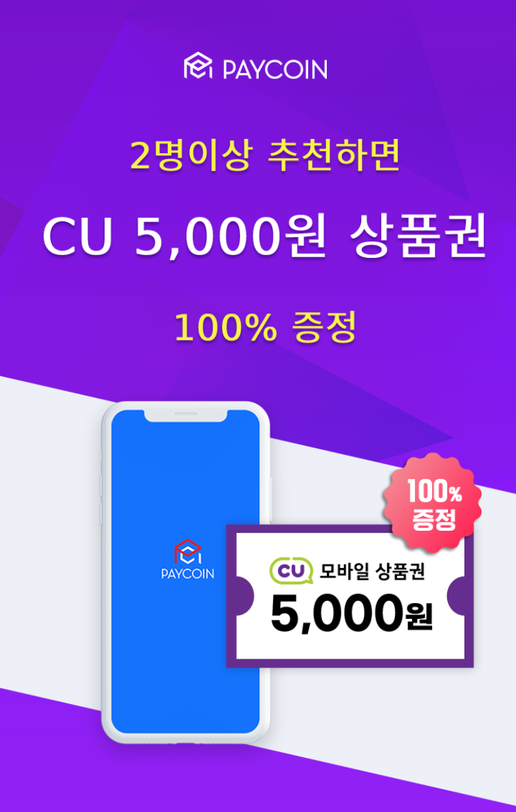 *상기의 이벤트 기간 내 내 리워드코드로 2명 이상 페이코인 앱 신규가입 시, CU 5,000원 모바일 상품권(*PIN코드 발송 형태)을 증정.