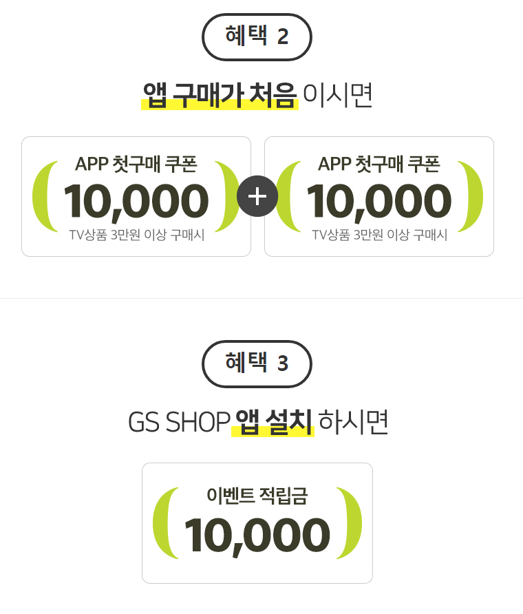 2) 혜택2 : GS SHOP 앱 첫구매시 사용 1만원 할인쿠폰 2장 지급