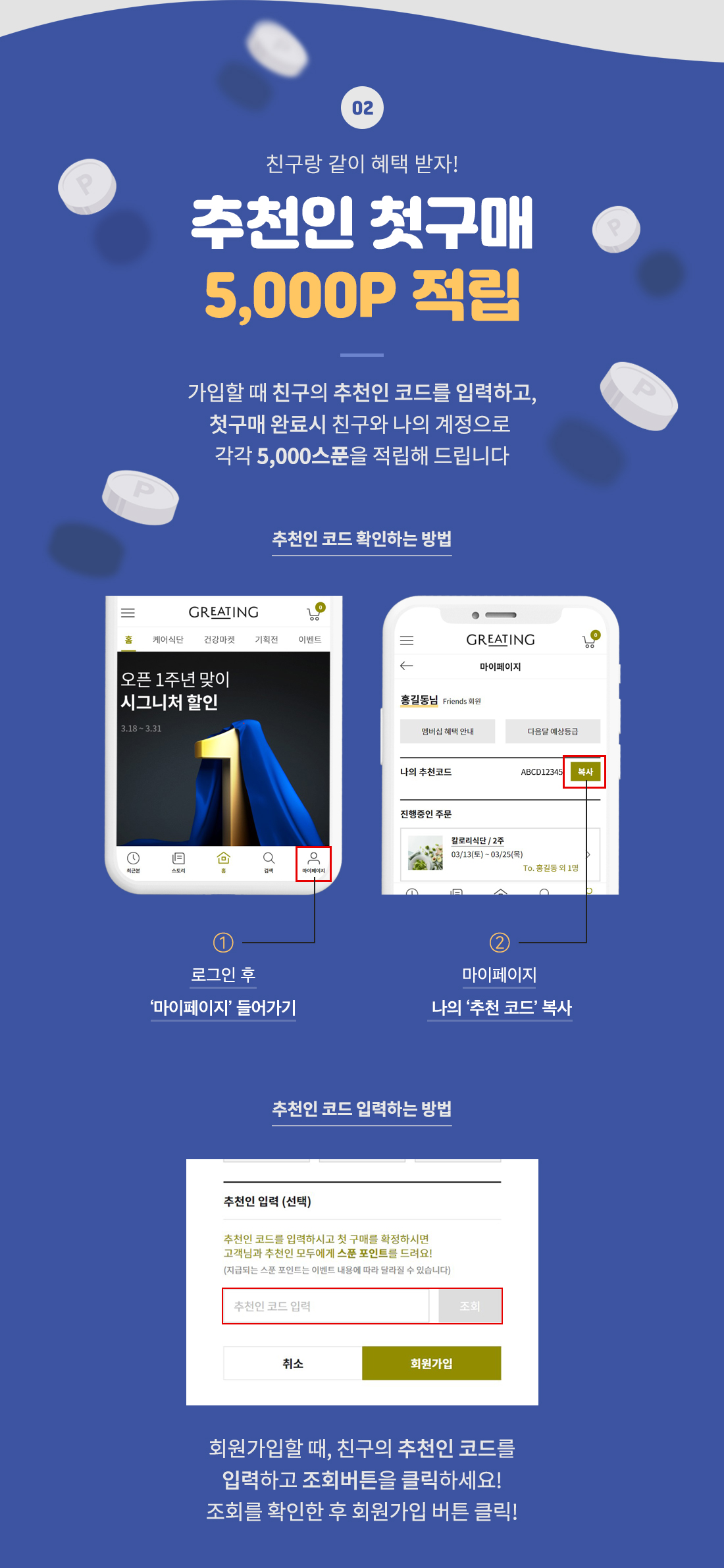 그리팅몰 회원시 추천코드 입력하여 다양한 혜택 받아보세요.