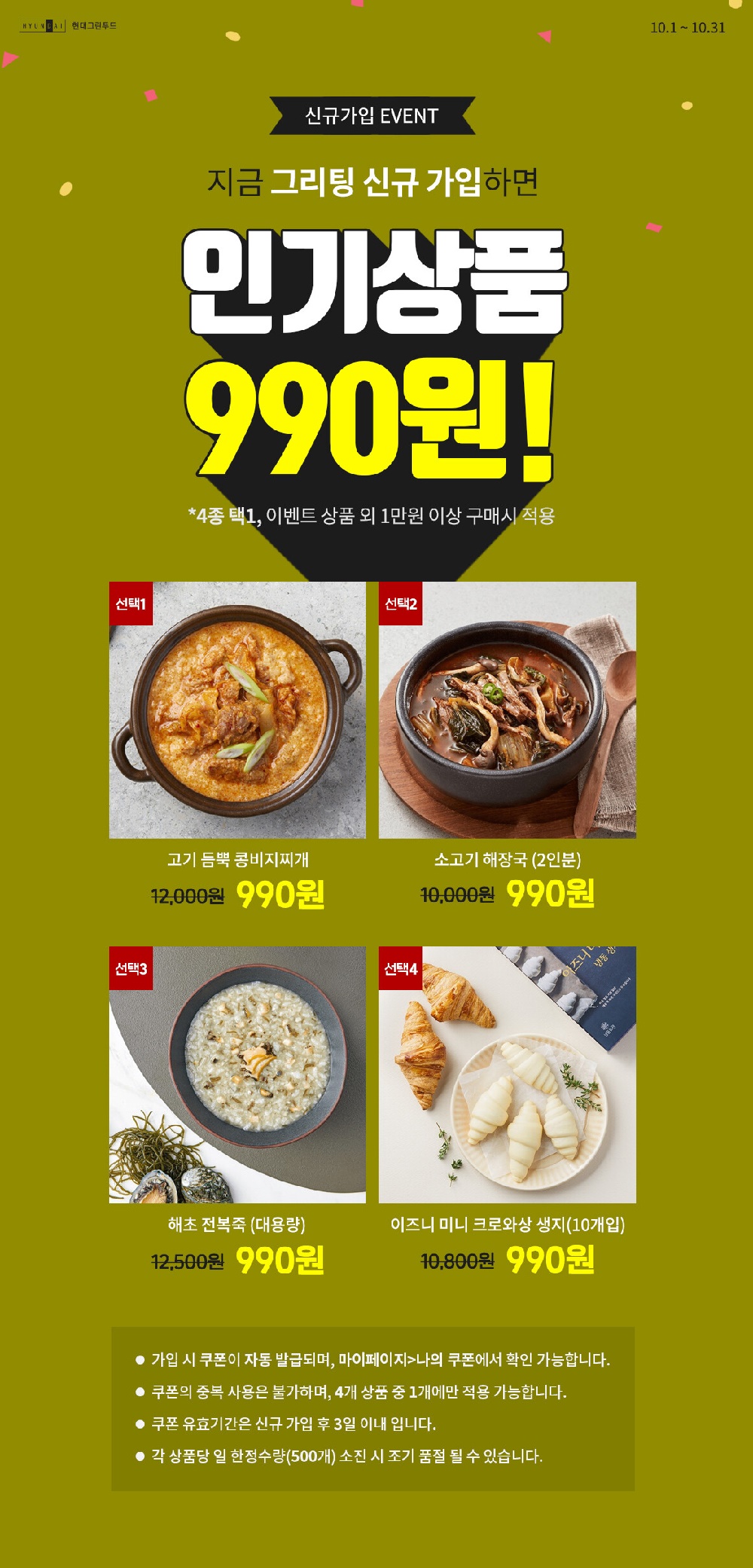 현재 그리팅몰에서 신규 회원가입 이벤트를 진행중이다. 신규로 가입한 회원에게는 10만원 쿠폰팩이 지급되고, SMS수신동의(1000P), 이메일 수신동의(1000P), 건강정보 수신동의(1000P) 선택하면 3000스푼(포인트)이 적립된다.