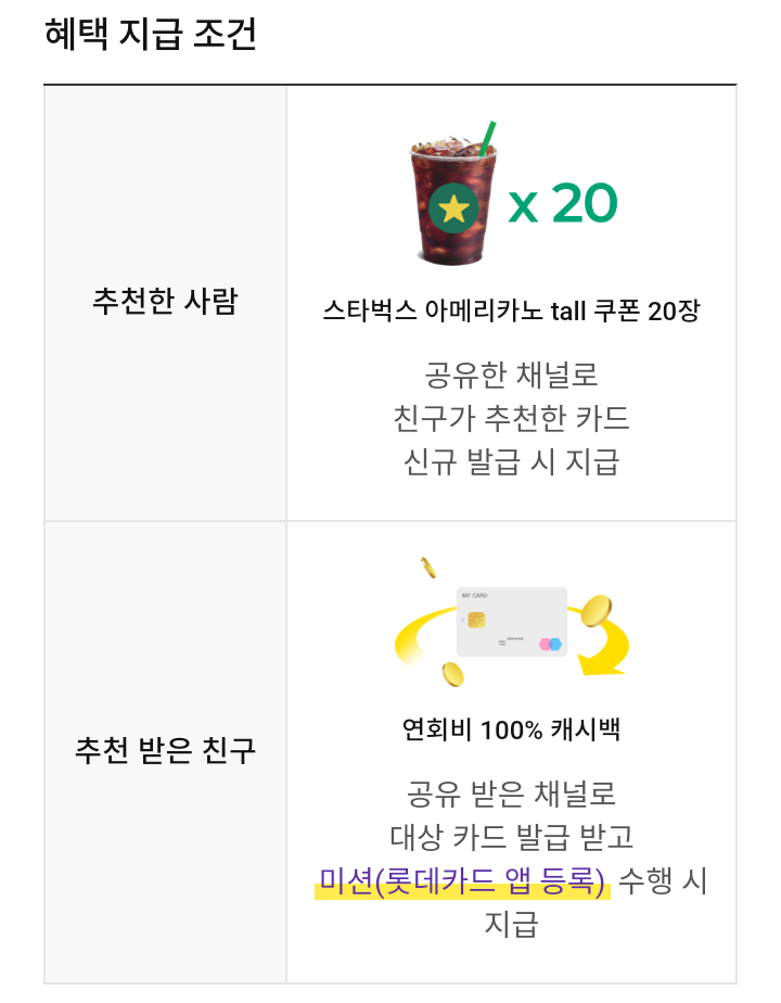 - 공유 받은 채널로 대상카드 발급 받고 미션(롯데카드 앱 등록) 수행 시 지급
