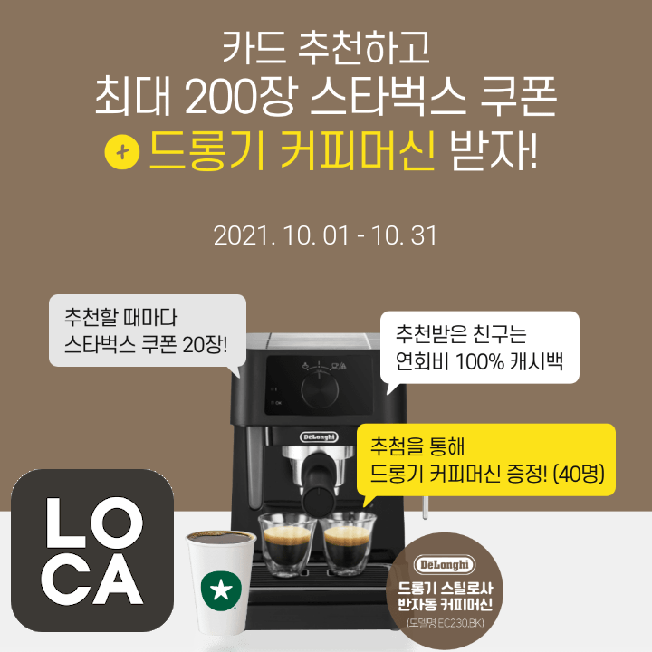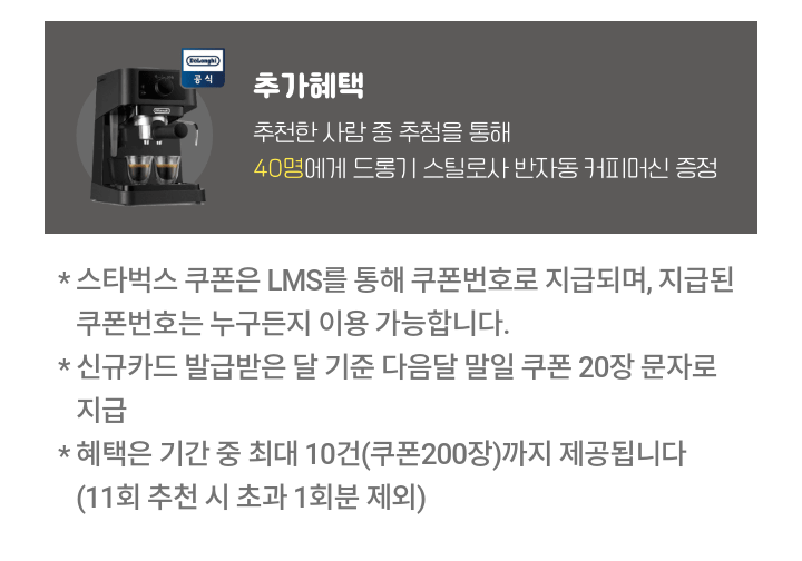 - 추천한 사람 중 추첨을 통해 40명에게 드롱기 스틸로사 반자동 커피머신 증정