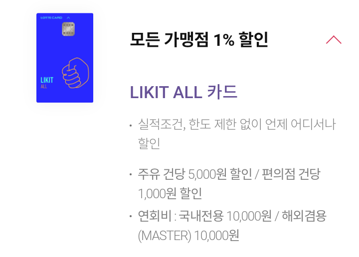 - 국내 모든 가맹점 최대 1%, 해외 모든 이용금액 최대 1%