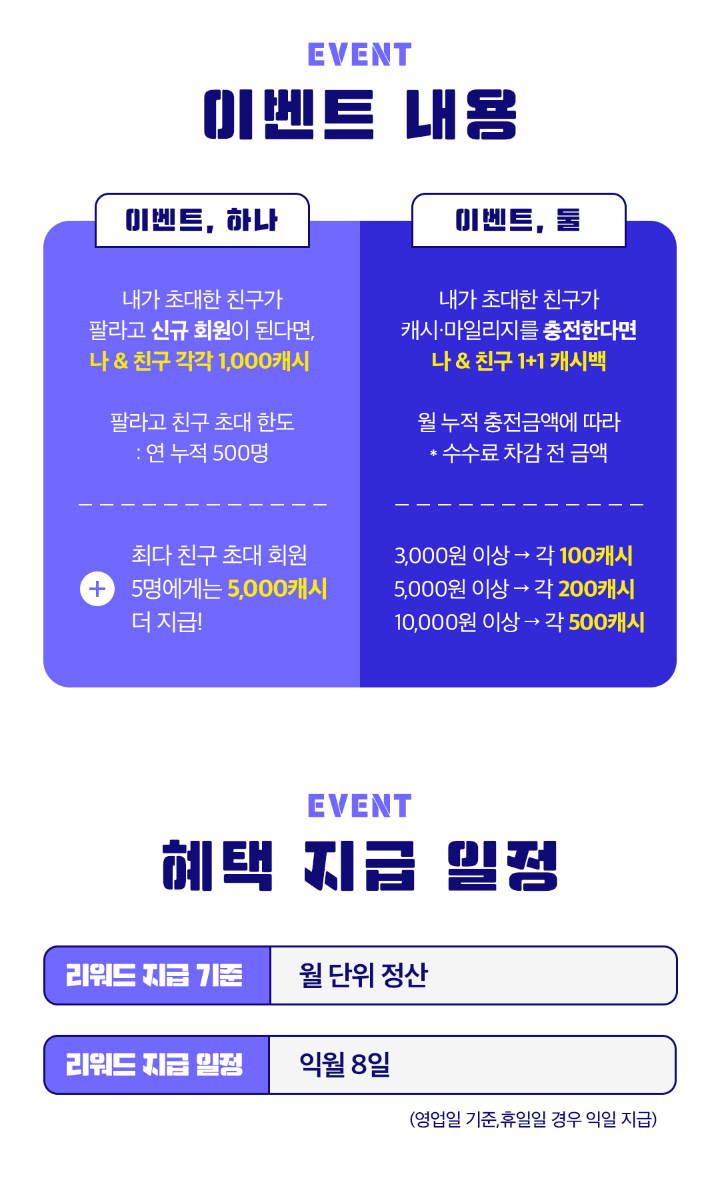 - 초대로 가입한 친구가 신용카드, 가상계좌, 토스, 해피머니, 도서문화상품권으로 3000원 이상 충전하면 나와 친구 1+1 캐시백