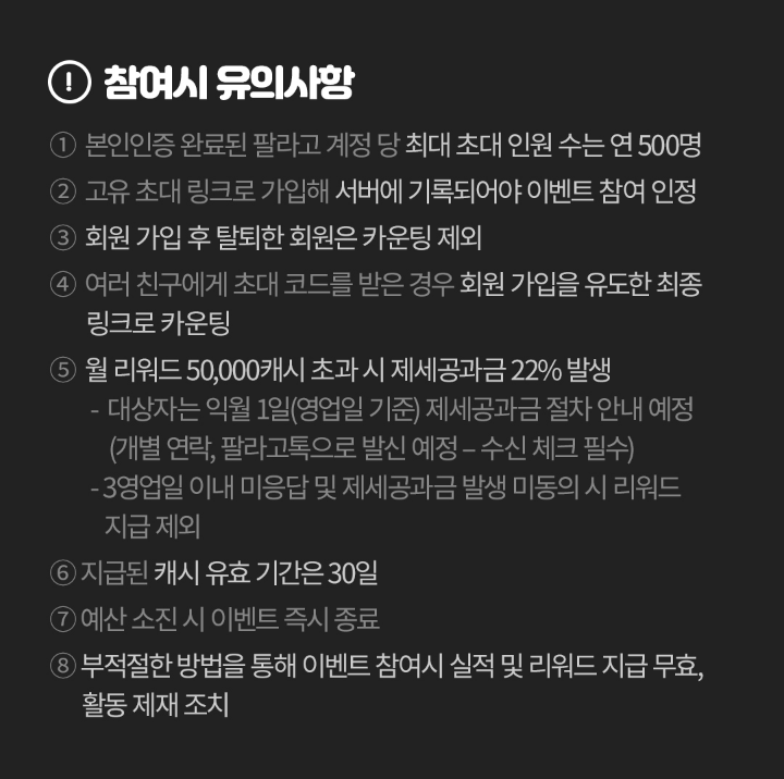 - 월 리워드 50000캐시 초과 시 제세공과급 22% 발생