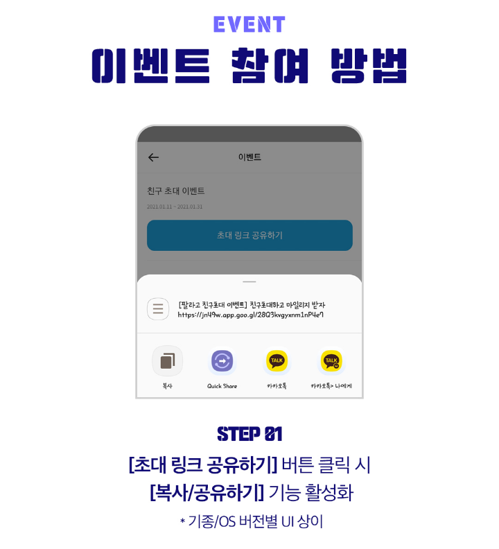 step 2) 복사한 [초대 링크]를 메신저, 카페/블로그/커뮤니티, 기타 SNS 등 자유롭게 친구에게 공유해 초대