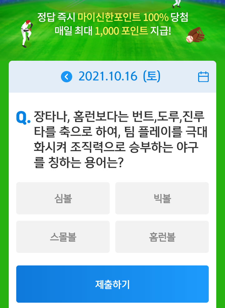 매일 야구상식 쏠퀴즈 풀고 마이신한포인트 최대 1000포인트 받아가세요.