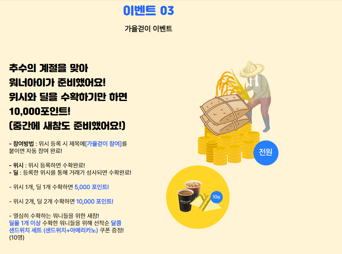 - 추수의 계절을 맞아 워너아이가 준비했어요! 위시와 딜을 수확하기만 하면 10,000포인트!(새참도 준비)