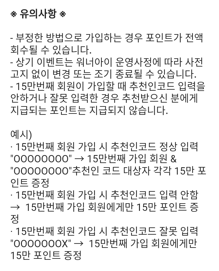 - 15만번째 회원 가입 시 추천인코드 잘못 입력 : 15만번째 가입 회원에게만 15만 포인트 증정