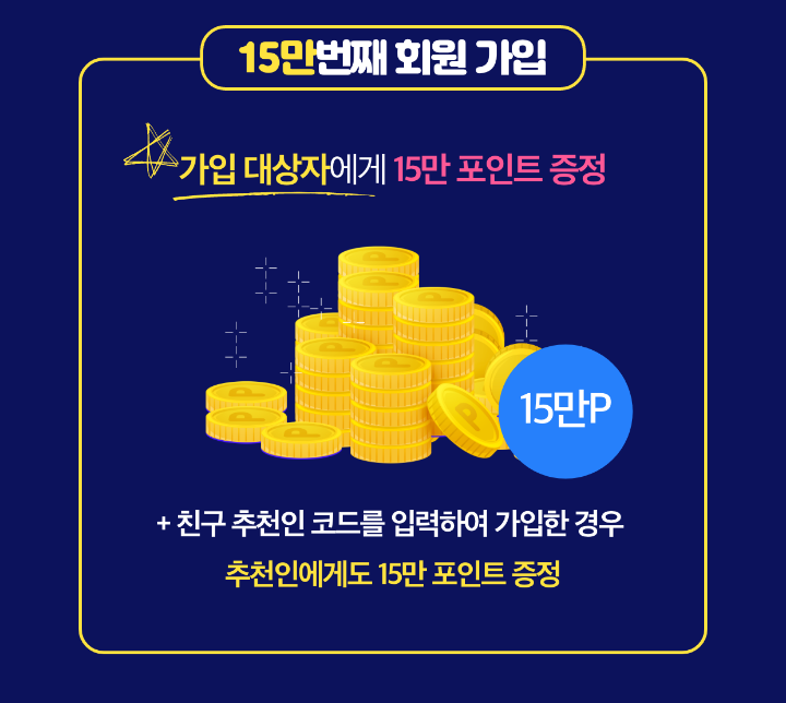 - 15만번째 회원 가입 시 추천인코드 입력 안함 : 15만번째 가입 회원에게만 15만 포인트 증정