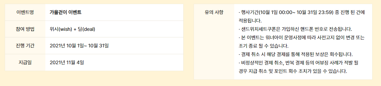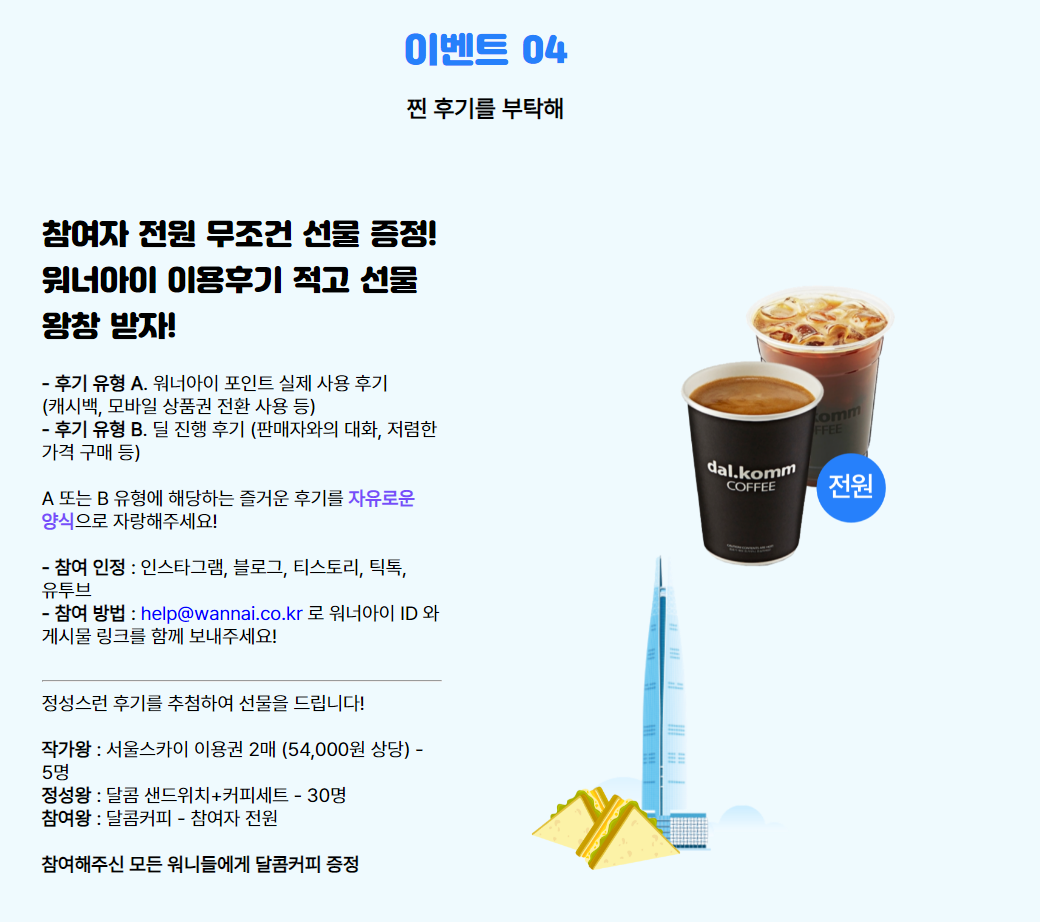 - 딜을 1개 이상 수확한 워니들을 위해 선착순 달콤 샌드위치 세트 (샌드위치+아메리카노) 쿠폰 증정! (10명)