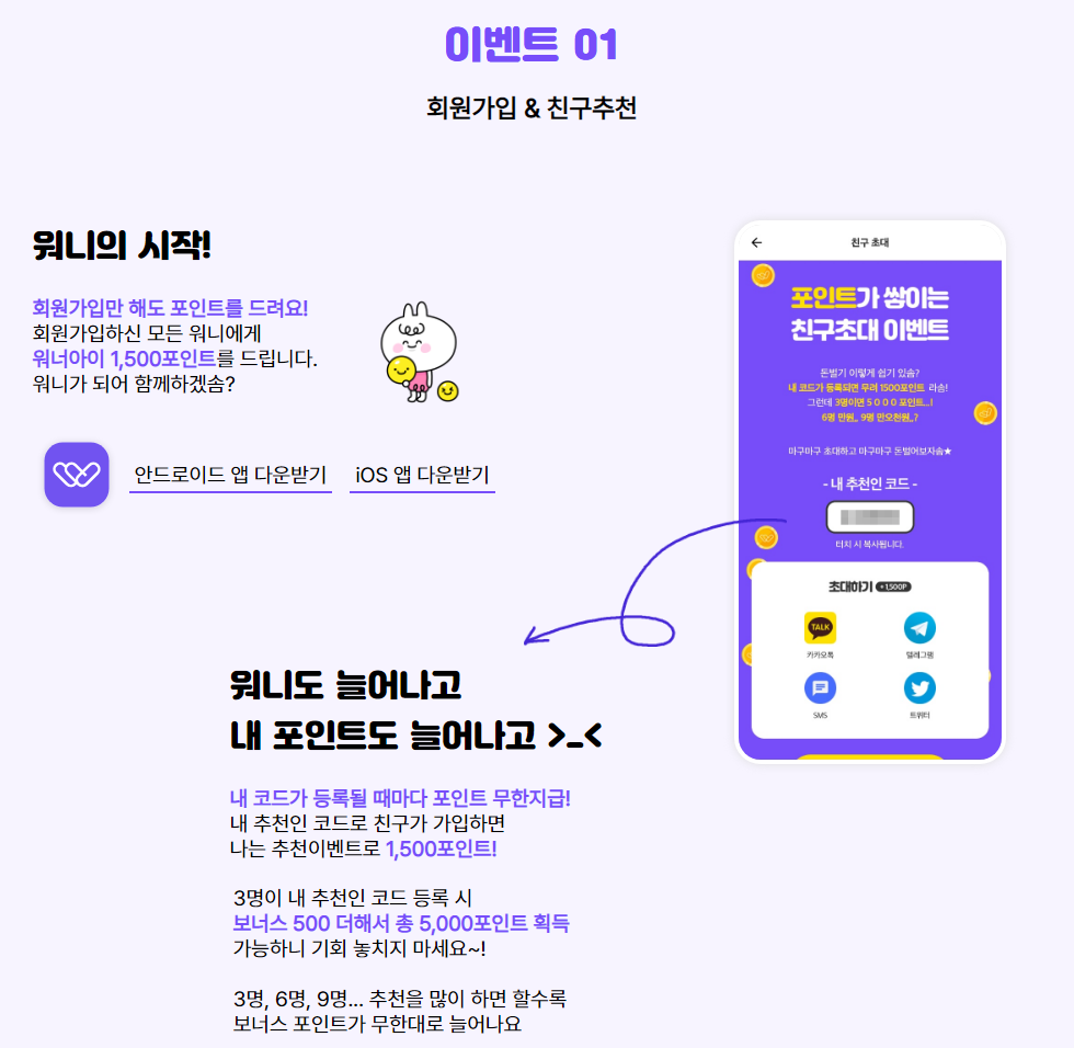 - 1명 등록 1500포인트 지급, 3명 등록 5000포인트 지급