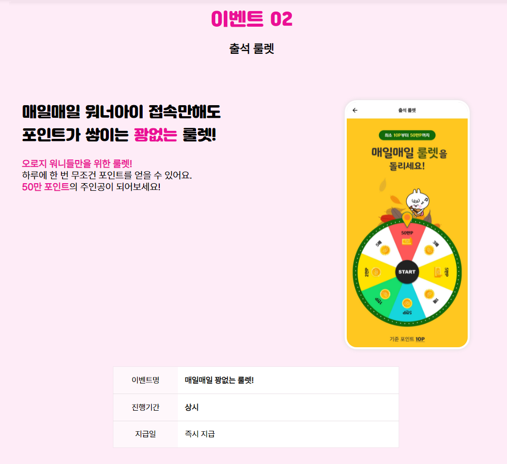 1) 매일매일 워너아이 접속만해소 포인트가 쌓이는 꽝없는 룰렛!