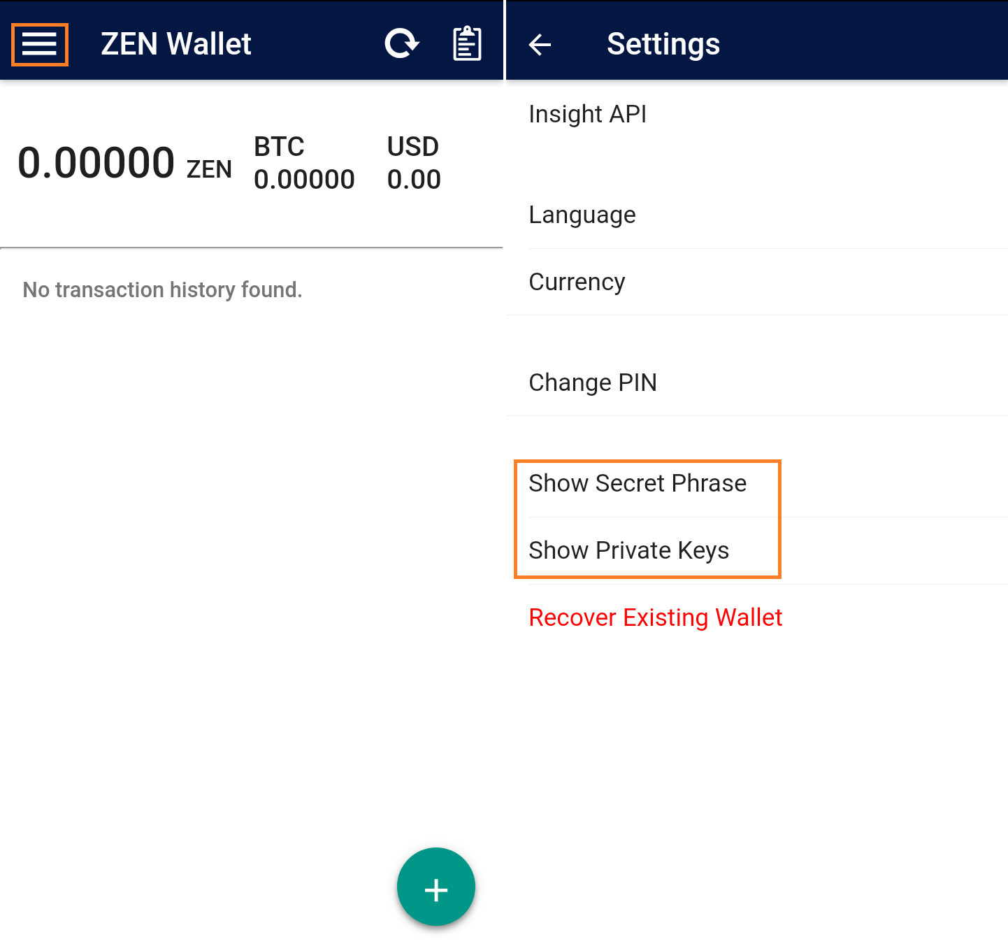 5) 왼쪽 상단 세줄 클릭 > Setting 클릭 > Secret Phrease 단어 백업 > Private Key 백업