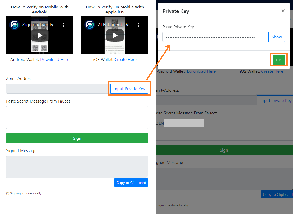 12) (팝업) ZEN 월렛의 개인키(Private Key) 입력(5번에서 백업) > OK 클릭