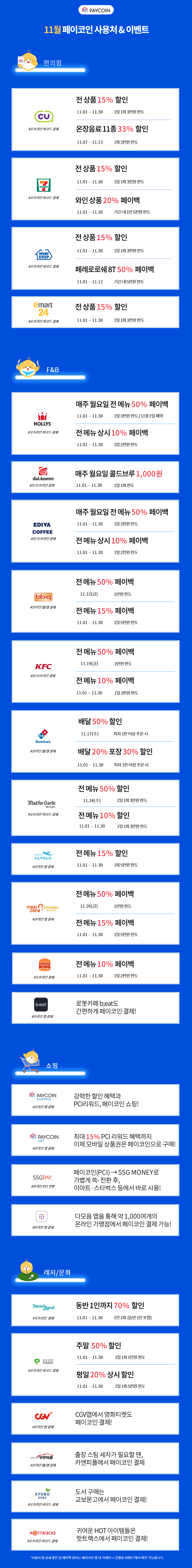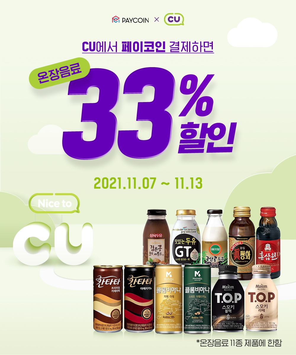 *이벤트기간(11/7~11/13)내 CU에서 온장음료 11종을 페이코인으로 결제 시 33%할인.