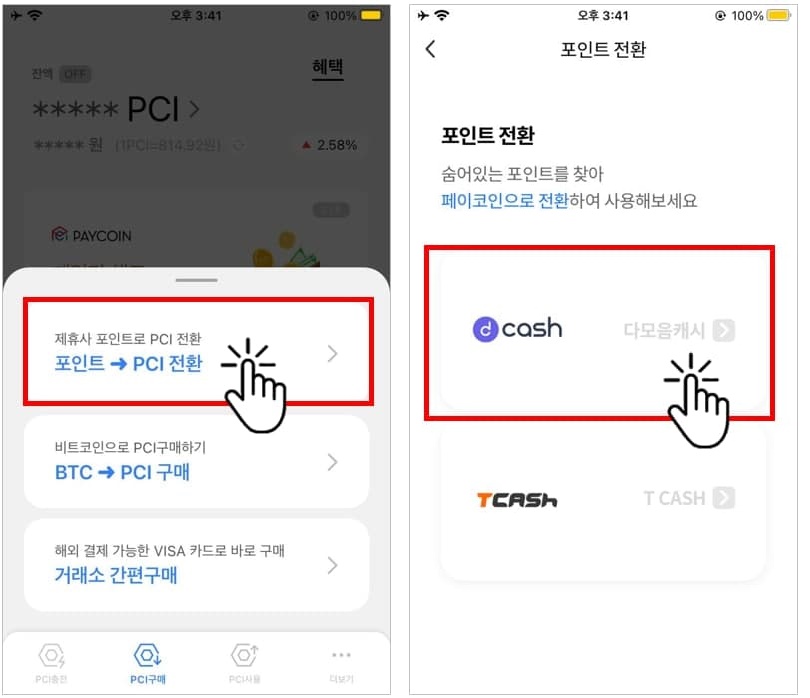 [페이코인 앱 실행] → [PCI 구매] 터치 → [포인트→PCI 전환] 터치 → [다모음캐시] / [T CASH] 선택 후 PCI 전환 진행