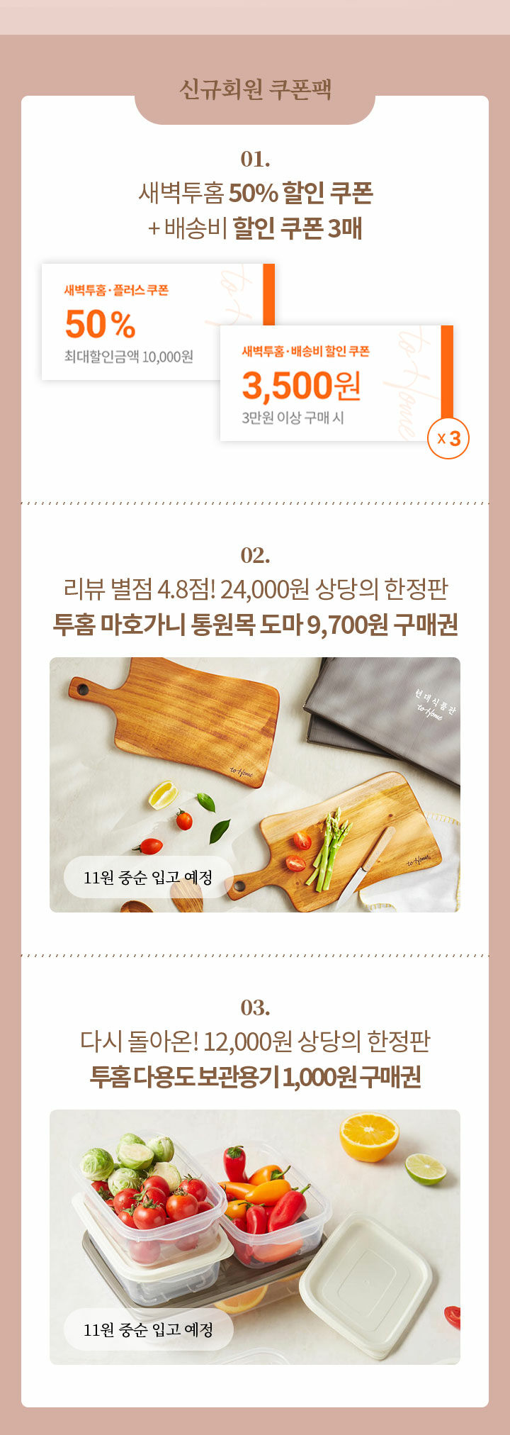 1) 새벽투홈 50% 할인 쿠폰 + 배송비 할인 쿠폰 3매