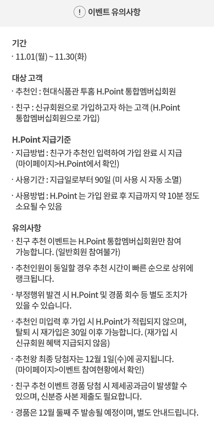 - 추천인 : 1명당 2000 H.Point 증정, 11월 추천왕 10명 혜택 증정