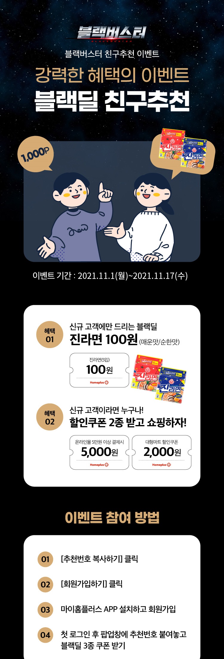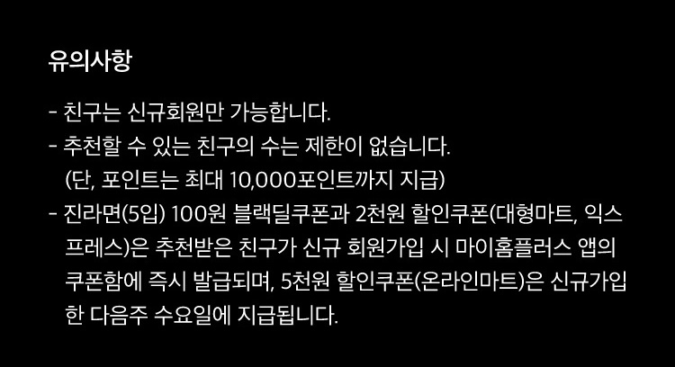 - 진라면(5입) 500원 블랙딜쿠폰과 2천원 할인쿠폰(대형마트, 익스프레스)은 추천 받은 친구가 신규 회원가입 시 마이홈플러스 앱의 구폰함에 즉시 발급되며, 5천원 할인쿠폰(온라인마트)은 신규가입한 다음주 수요일에 지급된다.