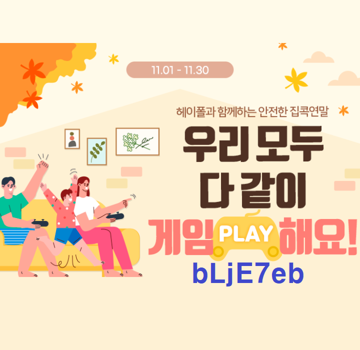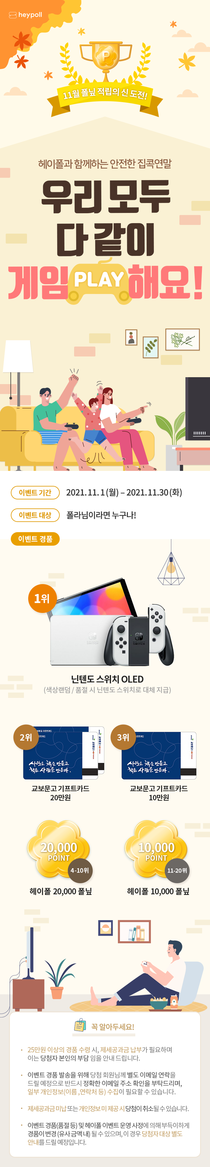 헤이폴에서 11. 1(월) ~ 11. 30(화)까지 11월 폴닢 적립 이벤트(안전한 집콕연말, 우리 모두 다 같이 게임해요!)가 진행중이다. 이벤트 경품으로 닌텐도 스위치 PLED(1위), 교보문고 기프트카드 20만원(2위), 교보문고 기프트카드 10만원(3위), 헤이폴 2만 폴닢(4~10위), 헤이폴 1만 폴닢(11위~20위)이 주어진다.