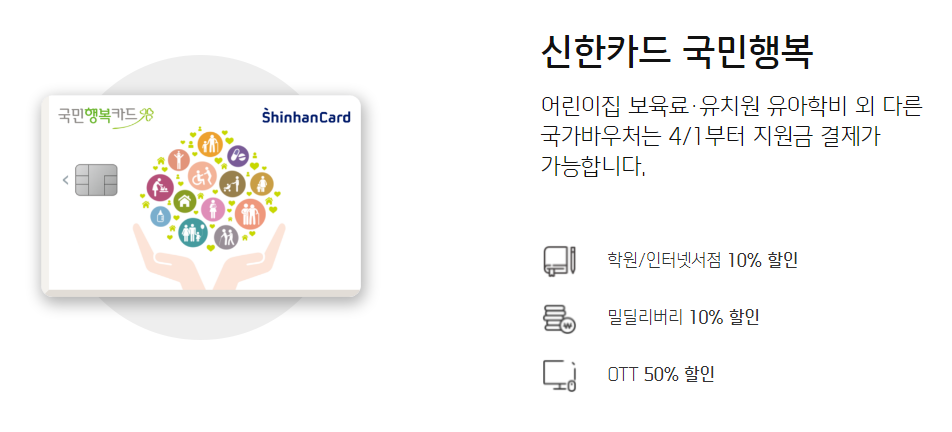 - 카드 신청방법: 신한은행 영업점, 신한카드 지점/홈페이지, 복지로 및 동주민센터에서 신청 가능