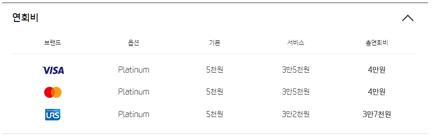 - American Express(플래티넘) : 3만5천원(기본 7천원 + 서비스 2만5천원)