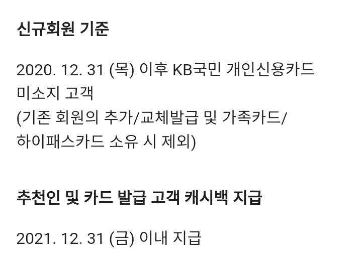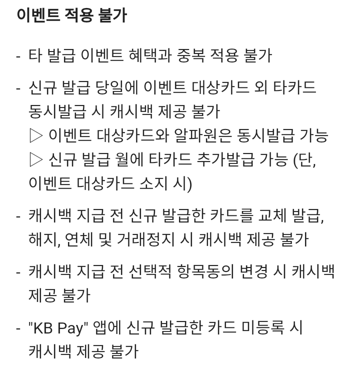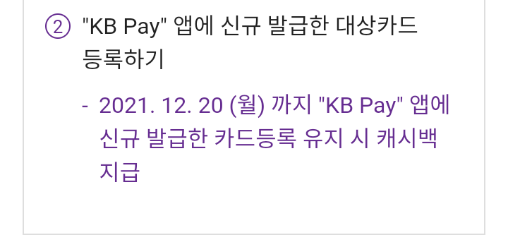 - "KB Pay" 앱에 신규 발급한 카드 미등록 시 캐시백 제공 불가
