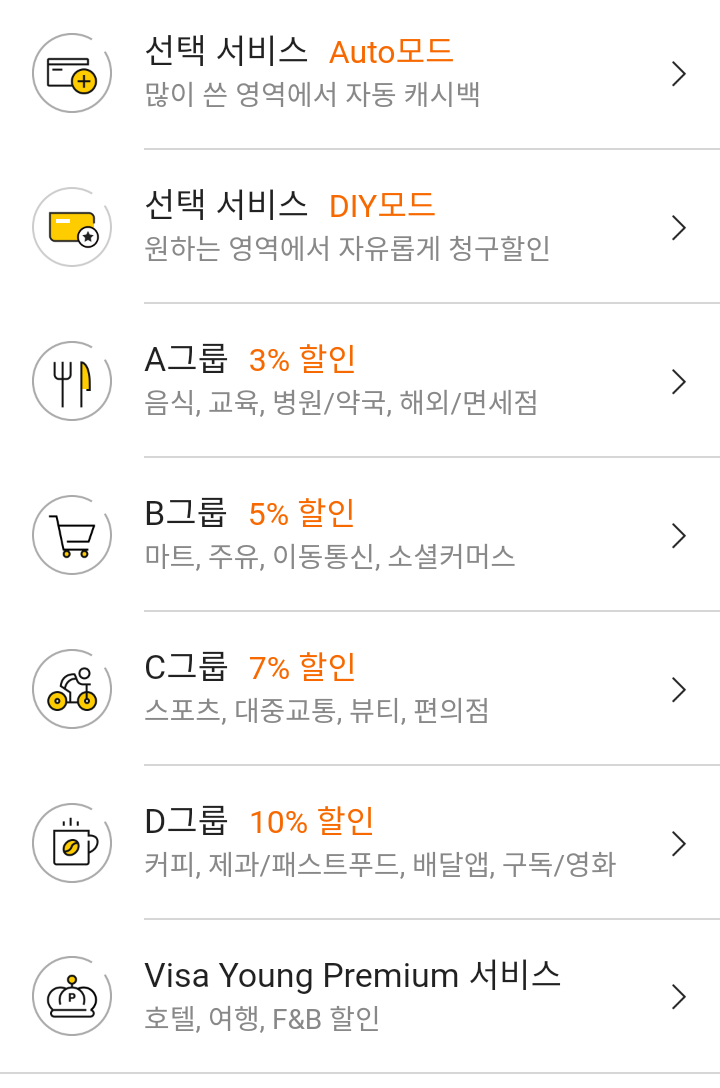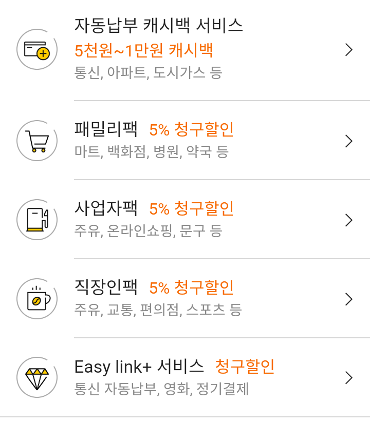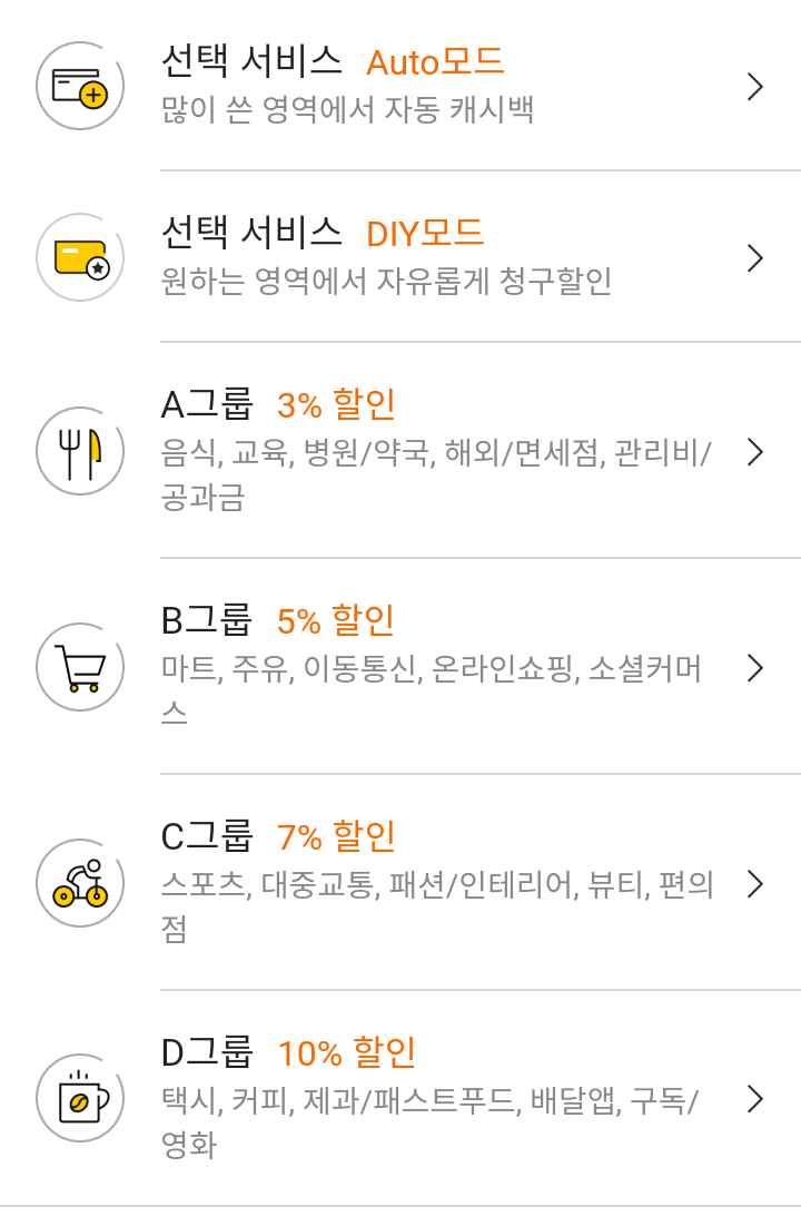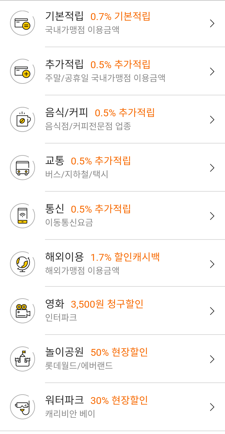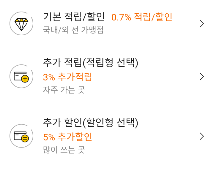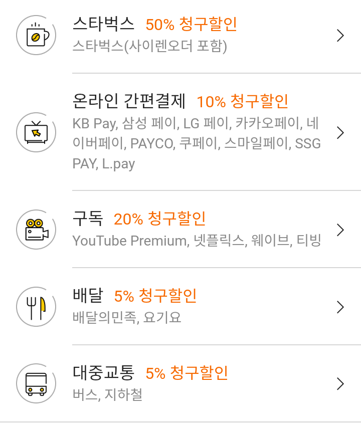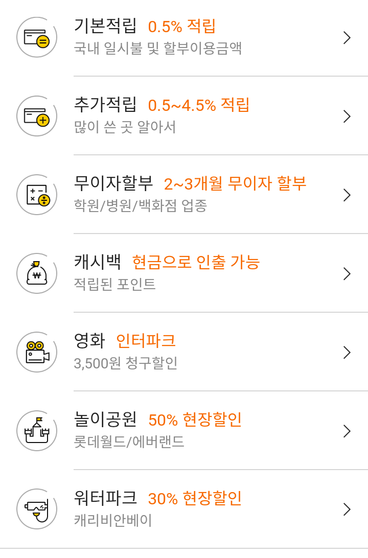- 선호영역(택1) 5% 포인트리 적립(소셜커머스, 온라인서점, 홈쇼핑, 백화점, 제과/아이스크림점, 커피, 편의점, 차량정비)