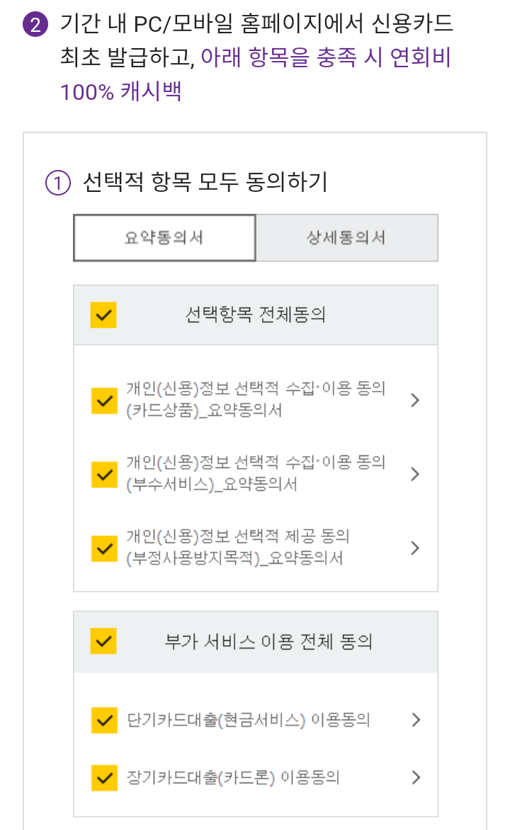 2) 기간 내 PC/모바일 홈페이지에서 신용카드 최초 발급하고, 아래 항목을 충족 시 연회비 100% 캐시백