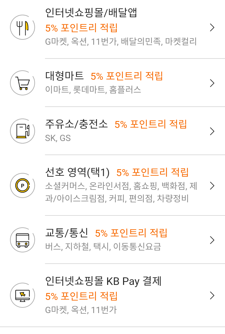 - 주유소/충전소 5% 포인트리 적립(SK, GS)