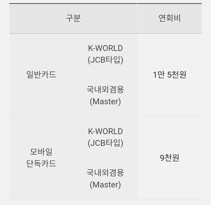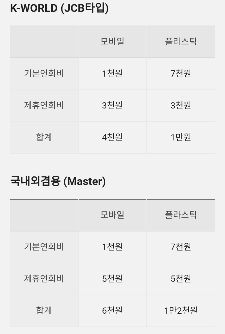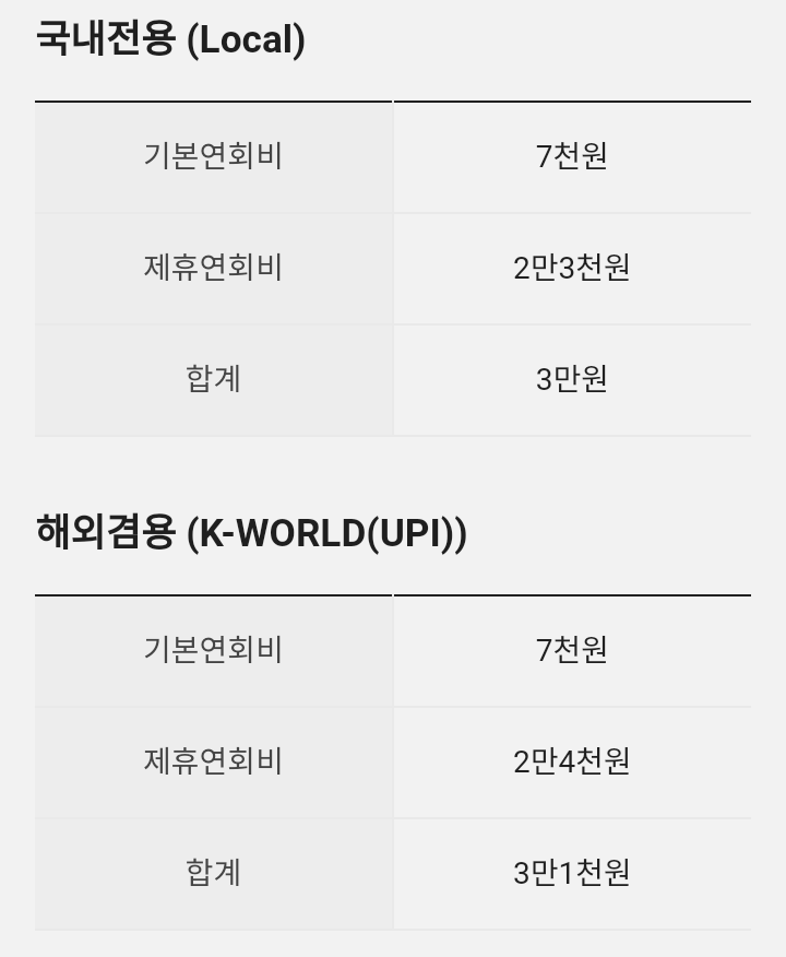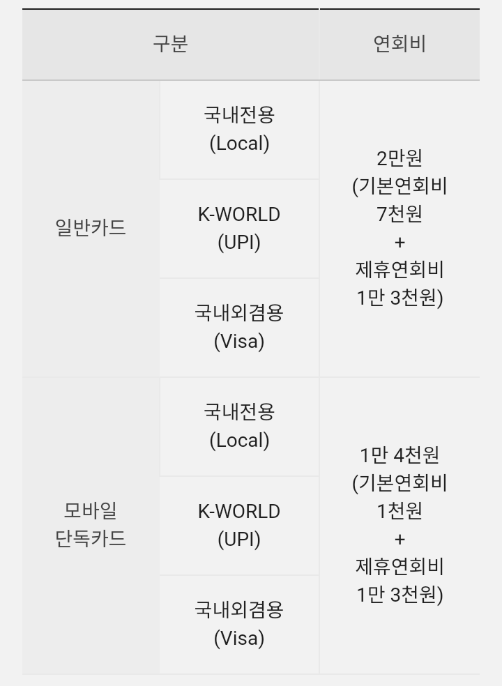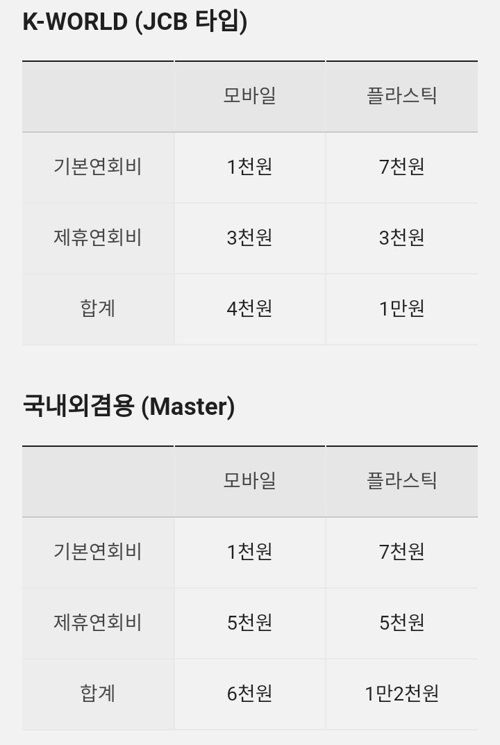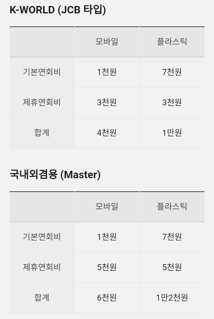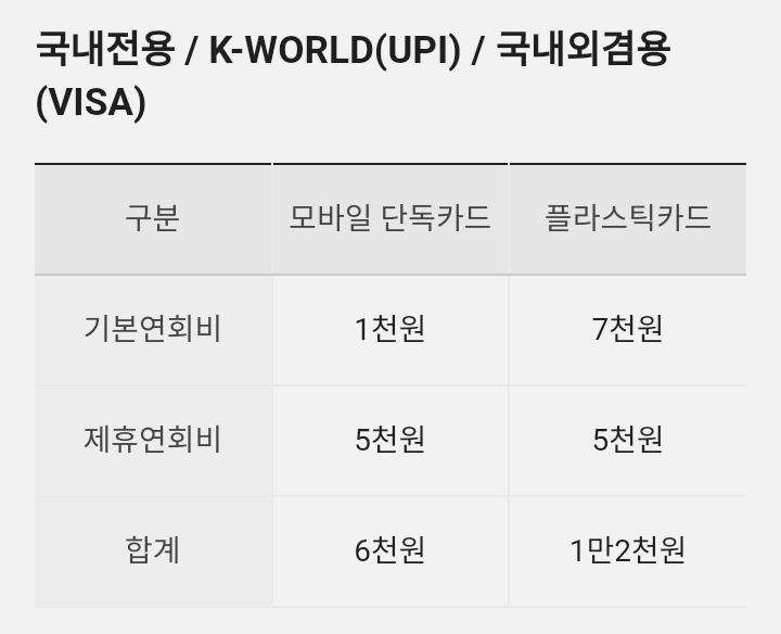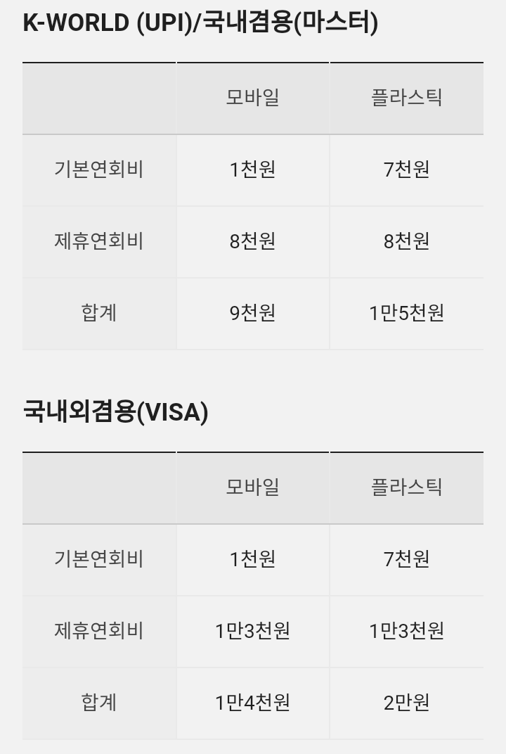 - 국내전용/K-WORLD(UPI)/국내외겸용(Visa) 1만2천원(기본 7천원, 제휴 5천원) / 모바일 단독 6천원(기본 1천원, 제휴 5천원)