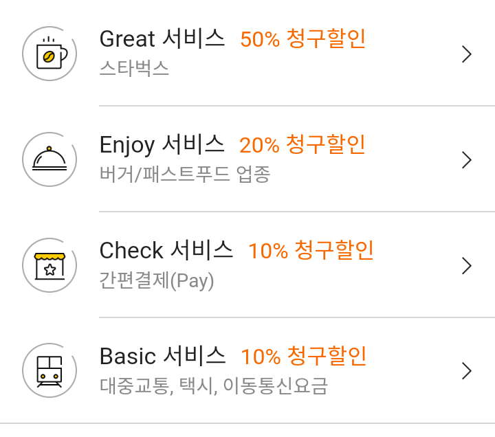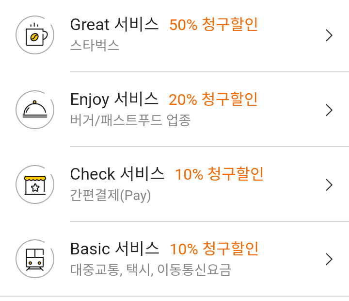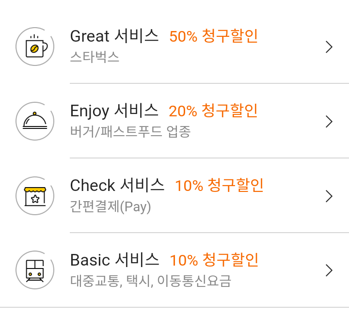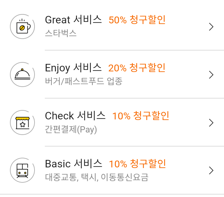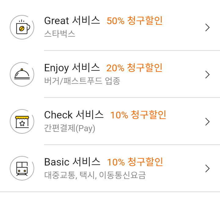 - Basic 서비스 10% 청구할인(대중교통, 택시, 이동통신요금)
