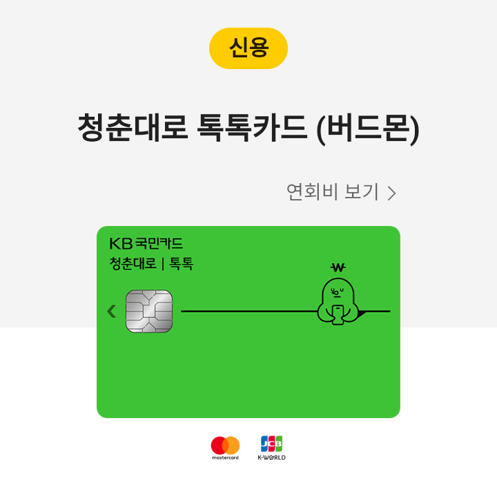 [청춘대로 톡톡카드 (버드몬)] 스타벅스 50%, 버거/패스트푸드 20%, 간편결제 Pay 10% - KB 국민카드