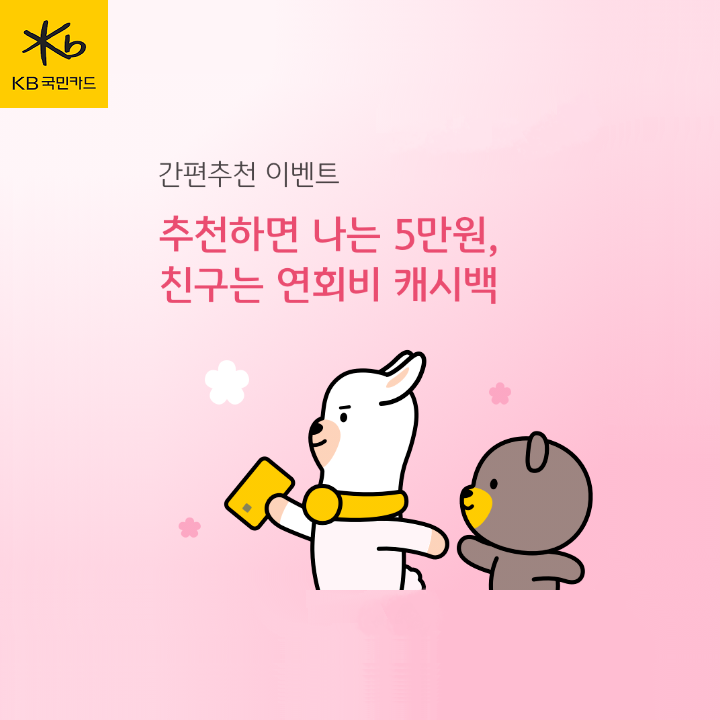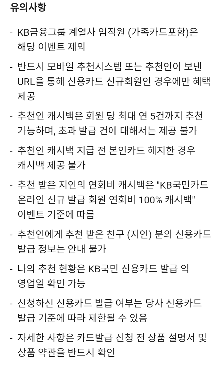 - 추천 받은 지인의 연회비 캐시백은 "KB국민카드 온라인 신규 발급 회원 연회비 100% 캐시백" 이벤트 기준에 따름