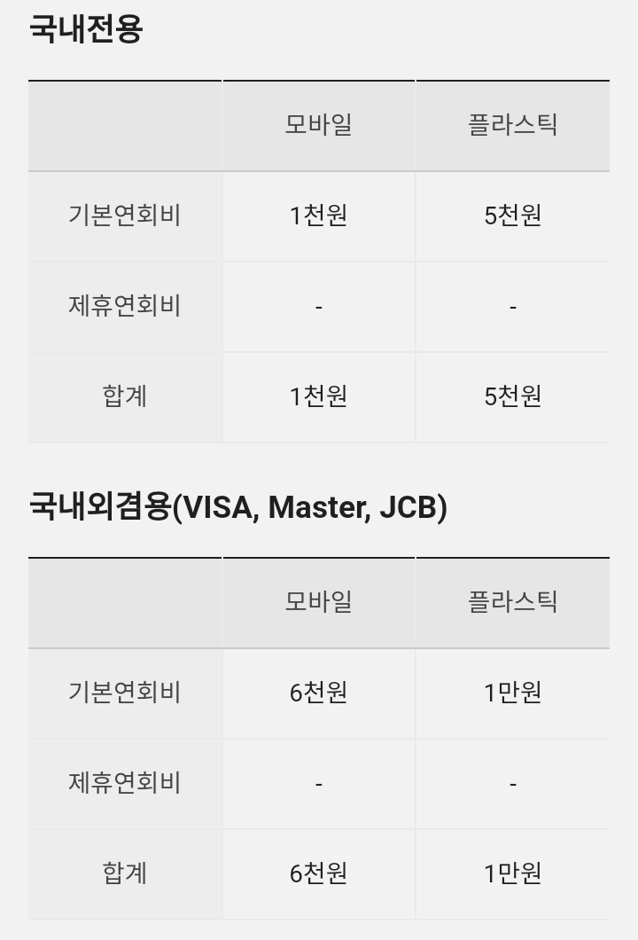 - 국내외겸용(MASTER) 2만원(기본 7천원, 제휴 1만3천원) / 모바일 단독 1만4천원(기본 1천원, 제휴 1만3천원)