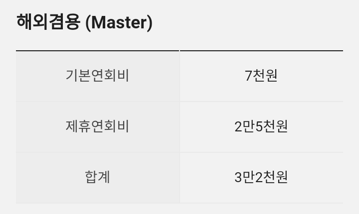 - 국내외겸용(MASTER) 2만5천원(기본 7천원, 제휴 1만8천원) / 모바일 단독 1만9천원(기본 1천원, 제휴 1만8천원)