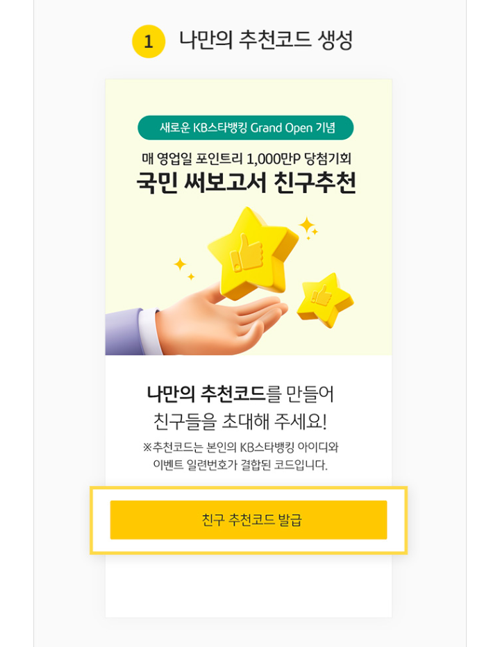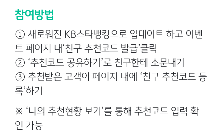 ① 새로워진 KB스타뱅킹으로 업데이트 하고 이벤트 페이지 내 '친구추천 코드 발급' 클릭