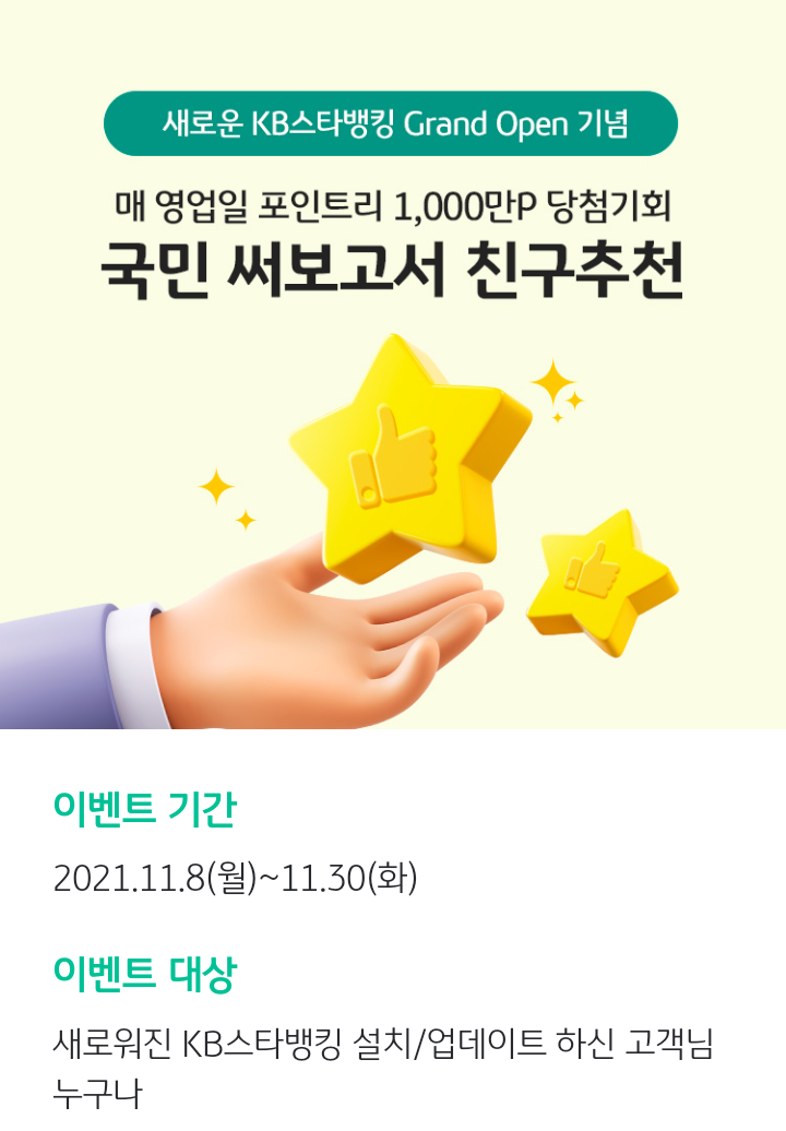 - 5000P 지급 대상은 2021.11.7 기준 KB스타뱅킹을 가입한 이력이 없는 최초신규고객을 대상으로 한다.