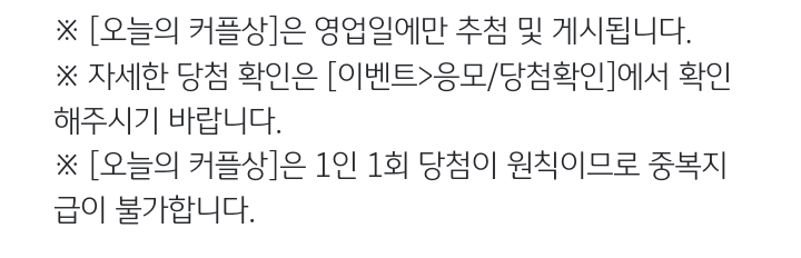 - 오늘의 커플상은 미당첨시 다음 영업일 추첨 대상에 포함된다.