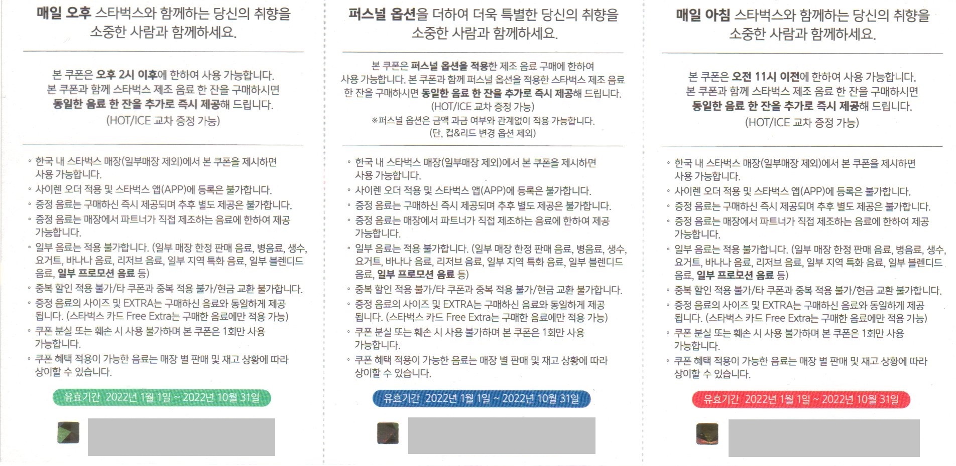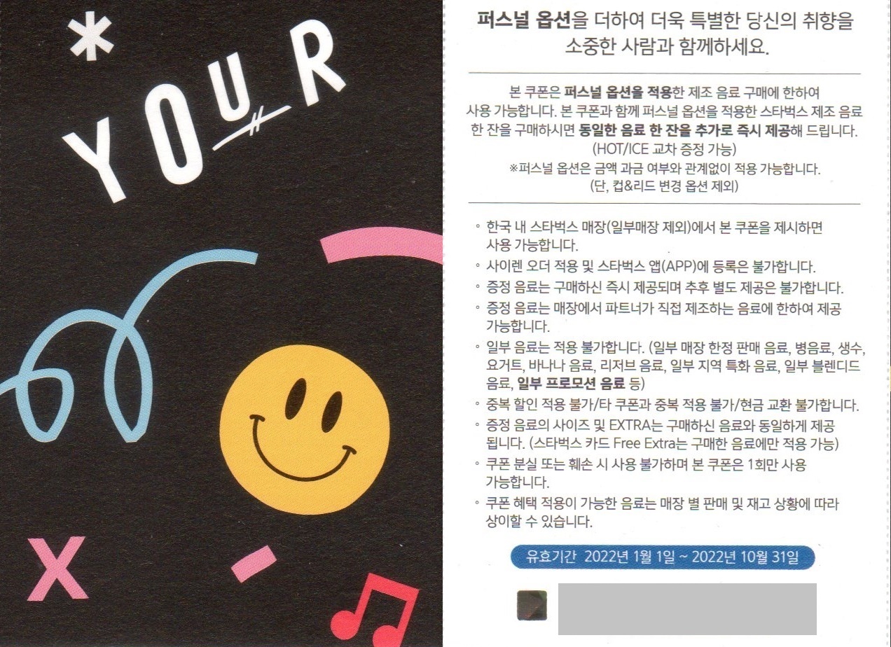 - 쿠폰과 함께 퍼스널 옵션을 적용한 스타벅스 제조 음료 한 잔을 구매하면 동일한 음료 한 잔을 추가로 즉시 제공(HOT/ICE 교차 증정 가능, 일회용컵으로 증정 가능)