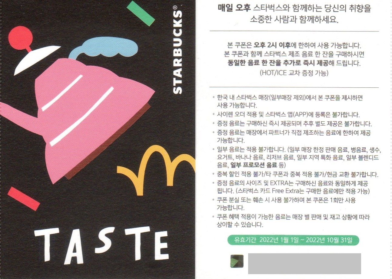 - 쿠폰과 함께 스타벅스 제조 음료 한 잔을 구매하면 동일한 음료 한 잔을 추가로 즉시 제공(HOT/ICE 교차 증정 가능)