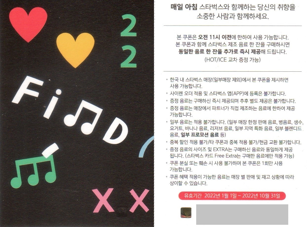 - 증정 음료의 사이즈 및 Extra는 구매한 음료와 동일하게 제공(스타벅스 카드 Free Extra는 구매한 음료에만 적용 가능)