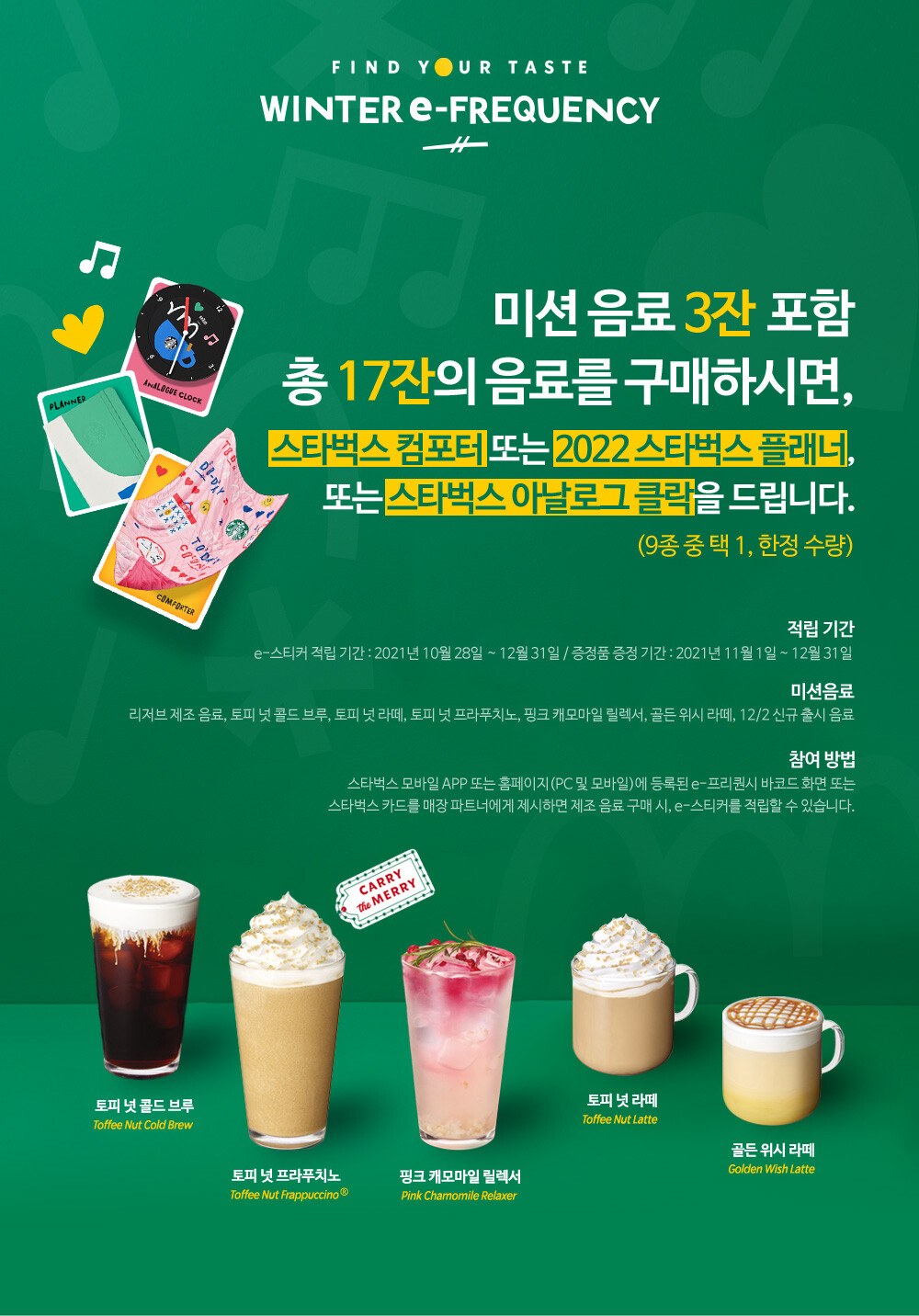 - 미션음료 3잔 포함, 총 17잔의 음료를 구매하면 스타벅스 플래너(3종류), 스타벅스 컴포터(3종), 스타벅스 아날로그 클락(3종) 중 하나를 받을 수 있다.