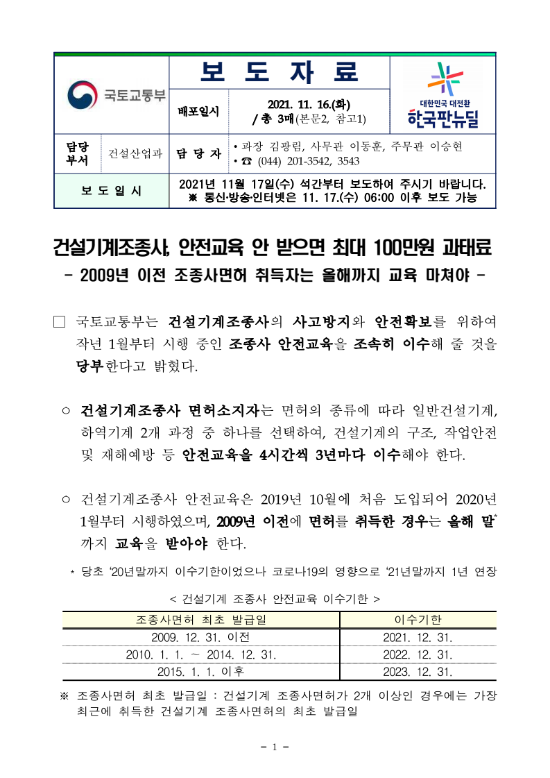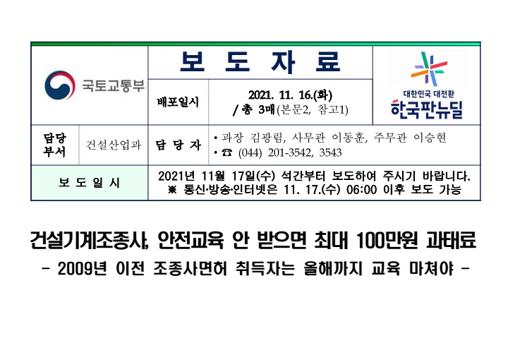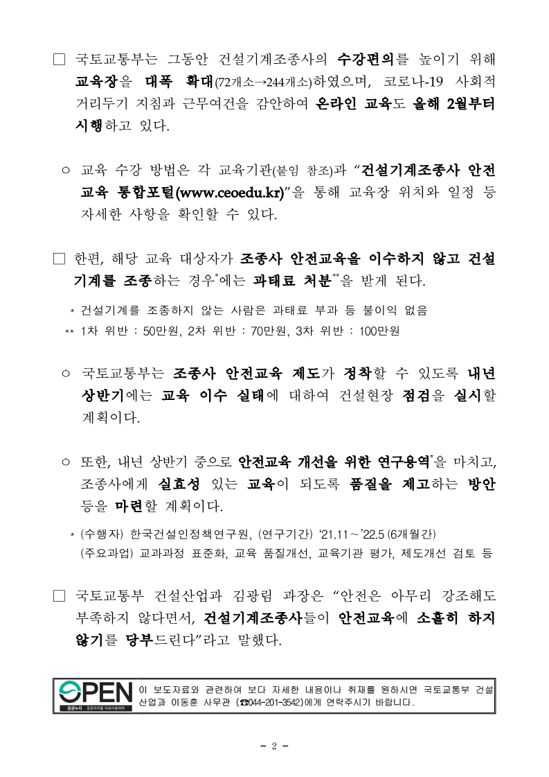 - 국토교통부는 건설기계조종사의 수강편의를 높이기 위해 교육장을 대폭 확대(72개소→24개소) 하였으며, 코로나-19 사회적 거리두기 지침과 근무여건을 감안하여 온라인 교육도 올해 2월부터 시행하고 있다.