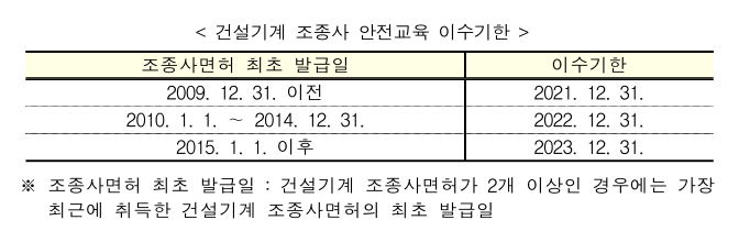 ▶ 건설기계조종사 안전교육은 2019년 10월에 처음 도입되어 2020년 1월부터 시행하였으며, 2009년 이전에 면허를 취득한 경우는 올해 말 까지 교육을 받아야 한다.
